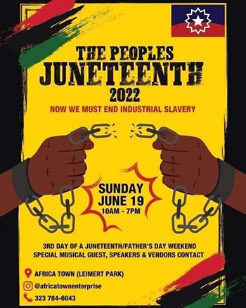 “It marks the official end of chattle slavery in the U.S.,” said Williams “Billion Godsun” Campbell, a member of Africa Town Enterprise. “Considering that a number of people in Los Angeles have migrated from areas like Texas and other areas in the South, there’s a direct historical linage that a lot of us do have to slavery.”