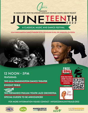 Lula Washington Dance Theatre will host a Juneteenth dance concert with performances by Dwight Trible and the Fernando Pullum Youth Jazz Orchestra, and world premiere choreography by Lula Washington performed by the Lula Washington Dance Company.