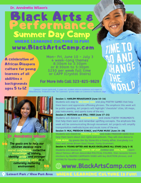 Dr. Anndretta Wilson is adding a cultural twist to summer camp. She has created the Black Arts & Performance Summer Day Camp, which begins June 10 at the L.A. Alpha House in View Park. The camp has four one-week sessions, and is for children ages five to 12 years old.